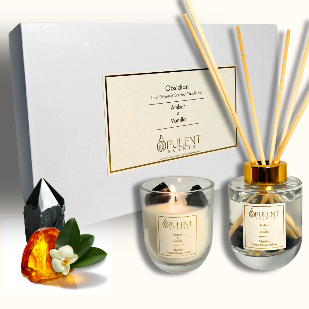 This luxurious gift blends soothing Amber & Vanilla aromas with the protective energy of Obsidian. Beautifully gift-boxed, it's perfect for creating a grounded cozy tranquil sanctuary. Treat yourself or a loved one to this exquisite gift set and transform any space into a haven of positivity.